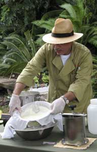 Have a colander lined with cheesecloth, set inside a larger bowl. Pour curdled milk into it to strain out whey (liquid). What to do with whey – can use in baking instead of water, use as base for soup or smoothies, or in pickling. (Hani pours it on his plants.)