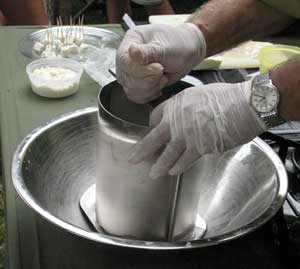 After it’s fully drained, put into cheese press (can get online at Gaiam). Press all the whey out, keep turning the press and keep pushing the whey out. Let it stand overnight. Don’t let the press stand in the whey.