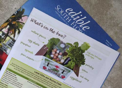 Last week edible South Florida came out with its first issue. The magazine is all about local food, foodies, chefs and growers. Farmer Margie and Bee Heaven Farm were mentioned in a well-written article about CSAs and buying clubs, and several CSA blogs — Eating Local in the Topics, Food For Thought, and Tinkering With Dinner — were also mentioned in a sidebar.