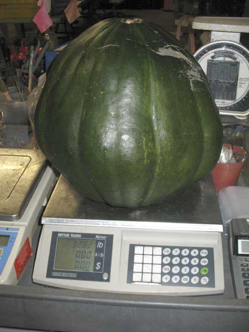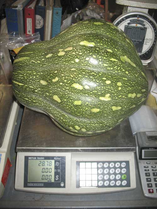 Last week Cliff Middleton brought over two giant calabazas. They were huge! One could fit inside a full share box, maybe. Grabbed a squash and waddled across the barn to weight it — 28 pounds! Weighed the other one — 32 pounds! What kind of organic goodness is Cliff doing over at Three Sisters Farm to get things to grow like that?? Or maybe it’s just the nature of the squash — they want to rule the world.