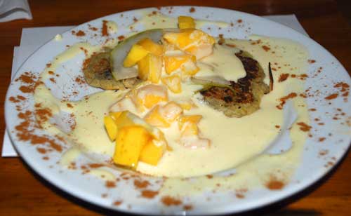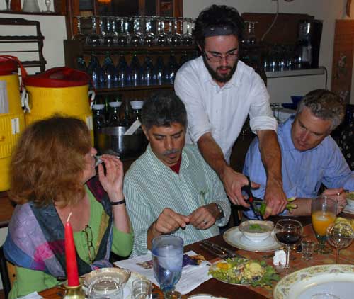 The dessert pancakes with cas guava and passion fruit sauce were more potato-y and heavier than at the testing dinner. Maybe if the edges had been a bit crispy, one guest murmured. The sauce, though, is exceptional, and I can see it on the souffle, or perhaps with breakfast crepes as another guest suggested. The pancakes were accompanied by araza wine, light in color, dry, with a bit of the tartness and flavor of the fruit coming through. (Araza is a tropical fruit that Robert brought back from Amazonian Ecuador. The fruit first appeared for sale this summer, although Robert has been growing it for 30 years. Hani Khouri had used it to whip up a fine batch of araza ice cream.)