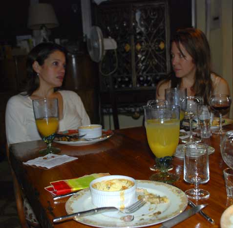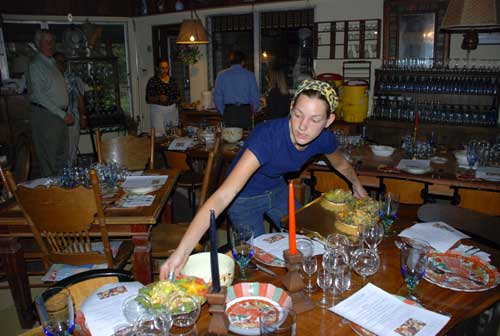 The dining room had high open beam ceiling and was lit softly with pendant lamps and a Waterford crystal chandelier. Guests had the choice of sitting at three tables, one which had its tabletop made from a single solid plank of guanacaste wood from Brazil. (It takes several very strong people to lift and move that table.) Around the room, china cabinets sparkled with glassware and plates. As we dined, a light rain pattered on the roof, adding to the cosy feeling. The house is authentic Old Florida, built in the 40s and 50s, and features a fireplace, two kitchens, a book-lined study, and a small winery in the back.