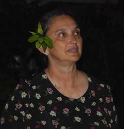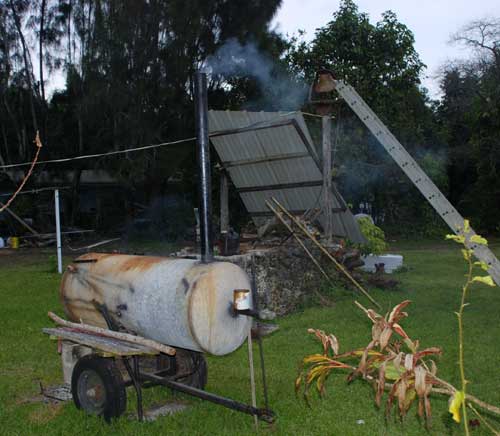 Despite the light sprinkling rain, we ambled around the house, looking at and smelling various things that Robert handed us — bay laurel, lemon bay, and bay rum (lemon form). Nearby was a rippling lake of citronella grass studded with diamond-like raindrops. Robert picked and passed around a perfumey cas guava, the size of a yellow ping ping ball, for us to smell. The wood fired smoker was puffing merrily as we approached. Robert opened a door on its side and revealed cut up potatoes smoking in a pan, and handed out chunks to taste.