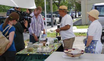 Melissa Contreras, who was helping out at the Redland Rambles tent, spoke on camera about different tropical fruits — tamarind, canistel and black sapote — that were available. Farmer Teena Borek sliced up a hothouse cucumber and was handing out samples, and suddenly everyone around was eating cucumber and liking it. Mike the cameraman was bedazzled by pretty vegetables and took lots of video of carrots. And cucumbers. And greens. Zarella stopped to buy a small bottle of tupelo honey from the Redland Organics tent before they wrapped up for the day.