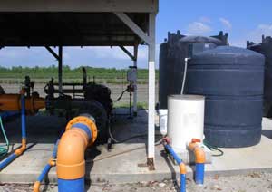 Crops are irrigated two different ways. There’s an automated double drip irrigation system (double meaning two lines of drip tape per planting row). Water is pumped from a ditch or a well, and liquid fertilizer is mixed in. A computerized system controls how much water is sent where and when. There’s also the seep irrigation system in which water is pumped into or out of the ditches to raise or lower the water table under the fields. The water seeps into the soil from underneath, rather than drip down from the top. Seep irrigation water is reused or recirculated several times before it is sent to a retention area. Excess water is treated to remove phosphorus before it is released back into a canal bordering the Everglades ecosystem.