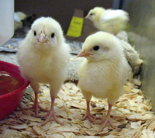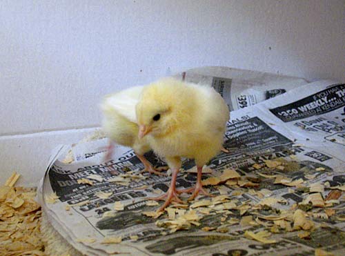 They live in a modified half chicken tractor set in the carport of the farmhouse. Their bedding is wood chips, newspaper and old carpet. They get fresh feed and water every day. At night, Farmer Margie tucks them into a cardboard box, where they keep each other warm through the night. She brings the box with chicks inside the house at night, to keep them from getting chilled from the cold.