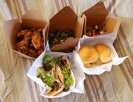 Back to the food from Dim Ssam… It was amazing! I tasted a variety of things. Juicy chicken wings with a soy-honey-ginger-pepper sauce that was not too hot but definitely flavorful. Kinchee made with French breakfast radishes, cucumber, bok choy and cilantro provided by the farm, and chunks of garlic, pickled in a peppery sauce that had a slight fermented kick. Grilled eggplant with garlic chives and a soy-based sauce. Pulled pork sandwich with a pinkish, zippy “kimchee” sauce. Crispy duck wrap with crunchy veggies, amazing sauces, and wreathed in fresh cilantro. Everything was so delicious, I wanted one of each from the truck, but my belly ran out of room. So leftovers went to James, the farm’s Intern Composter, who was wandering around hungry for food scraps, and happy for a taste of Sakaya cooking, yum!