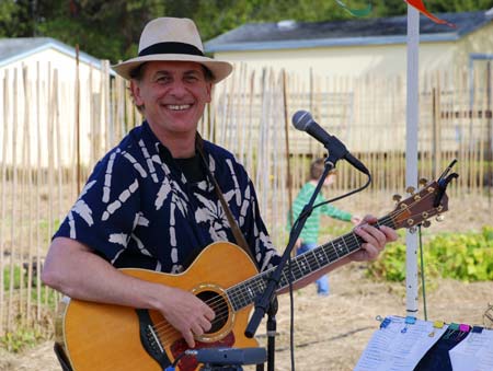 People sat on bales of straw and ate at tables in the sun outside the barn. It was close to the food and the coolers full of homemade herbal teas — lemongrass, roselle, and allspice berry. From there you could watch kids building scarecrows and listen to live music. Grant Livingston was back to charm us with his songs and stories about life in Florida. He sings and plays guitar in a laid back folk style, and his catchy tunes have gentle humor and poetic turns of phrase.