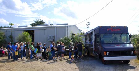 Inside the barn, a small farmers market was set up. If you haven’t been out to Homestead, Overtown or Pinecrest Markets, it was a fair representation of what you’ve been missing. A long row of tables zig-zagged along one wall, loaded down with produce. Fruit was on one end — passion fruit, tart “tangy-rines”, starfruit, avocados, red grapefruit, black sapote, and papaya. Greens and herbs loaded down the other end — yukina savoy, mixed salad greens, lettuce, arugula, garlic chives, dill, sage — and interesting vegetables in the middle — eggplant with funny appendages, watermelon radishes that have white flesh with a red center, globe radishes, dragon tongue beans, and maybe the last of the green beans for a while because of the last freeze. A lot of this stuff you just won’t find in the stores.