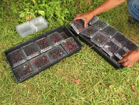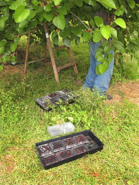 On a farm visit last Friday, I strolled past one of the mulberry trees and saw something going on. Human legs showing from under the full, leafy branches, and also the legs of a wooden step ladder. I circled around and saw packages of mulberries lying on the grass. The legs belonged to Pedro, the farm’s helper.