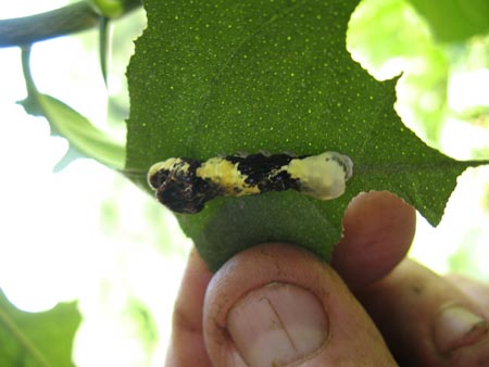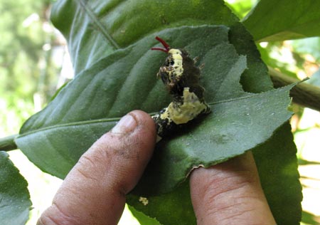 Last month I stopped by Possum Trot Tropical Fruit Nursery, and as usual, brought my camera. I look forward to those visits, because there’s always something new happening. Walking around with Robert Barnum looking at trees and plants never gets old. Robert pointed out something that looked like a massive bird dropping on a leaf, a blotchy browish-black and white blob, and said it was actually the caterpillar of the giant swallowtail butterfly. It was the biggest, ugliest caterpillar I had ever seen. And it had been quite busy, was chewing up large chunks of a Ponderosa lemon seedling’s leaves. In fact, they like eating citrus leaves very much, which could be a problem. Citrus greening is killing local citrus trees, so there goes its food supply.