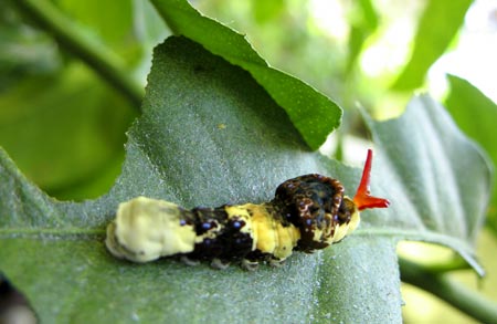 The caterpillar’s ugly looks were actually its main defense from getting eaten. A bird would look at that and wouldn’t think it’s food. The caterpillar also had another way of defending itself, Robert said as he touched its back. It immediately arched up a bit and something that looked like a red forked tongue came out of one end. It’s called an osmeterium and it gives off a noxious odor to repel its predator. Robert asked if I wanted to smell that finger, but I shied away, no thanks, take your word on it.