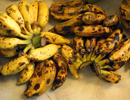 Sadie was working in the barn the last Saturday when I came to pick up my summer fruit order. She was sitting at a table with several bunches of blotchy bananas. They didn’t look very good, but when Sadie peeled one, the flesh was perfectly ripe and ready to eat. Because the skins weren’t pretty enough, the bananas would be used in another way.