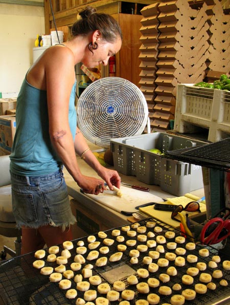 Sadie trimmed bruised spots, and cut thick slices, almost a half inch thick. Those were laid on a dehydrator drying rack spaced about an inch apart. When the rack was full, it went inside the large dehydrator humming in a corner. It already held several racks of bananas and star fruit in various stages of dryness. The fruit will take several hours to dry. Then it will be put in the Fruits of Summer dried fruit mix that Bee Heaven Farm sells at farmers markets in the winter.
