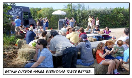 But the feared stampedes didn’t come, and if you stayed away for that reason, you missed out on some laid-back country fun. About 250 people came to hang out, eat, listen to live music, go on a hay ride, build a scarecrow, and shop at the farm market set up inside the barn. There you could find all kinds of fresh produce, honey, salt, and rice — all local and most organic (honey and salt can’t be certified organic). Outside, people browsed through a heirloom tomato plants. It was a gorgeous day — sunny but not too hot, and with enough breeze so it didn’t feel too humid.