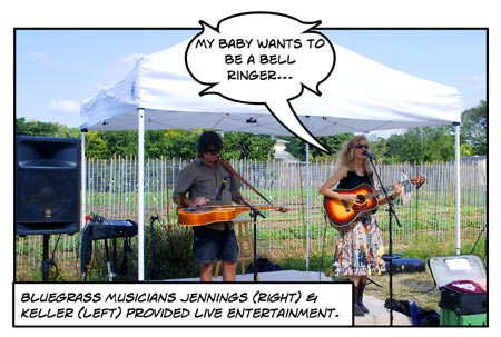 People ate sitting on bales of hay at tables set up in front of the barn. Nearby was a tent and platform set up for local folk musicians Jennings & Keller, formerly of Homestead’s now departed Main Street Cafe. They performed at last year’s Farm Day also.