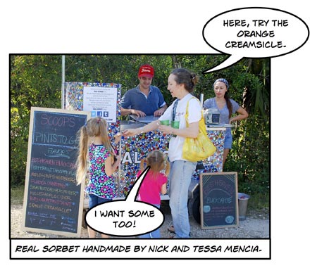 The Real Sorbet food cart was popular too. Owners Nick and Tessa Mencia were offering tastes and scooping up cupfuls of their handmade frozen fruit treats. The featured flavor was Black Sapote, made from fruit grown not too far away from where the cart was standing. Their concoction included chopped hazelnuts, almond milk, cocoa and a hit of espresso. It made for an interesting, mocha-ish flavor, but the dark earthy flavor of black sapote could have been stronger. Tessa said their specialty is vegan, non-dairy sorbet made with local fruit in season (some flavors may contain nuts or alcohol).