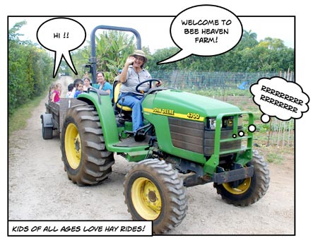 The biggest thrill was the hay ride. Kids and their parents perched on bales of hay loaded on a trailer hitched to the green John Deere tractor. Every 20 minutes, Farmer Margie took them for a tour. They rode at a leisurely two miles an hour as they circled the farm. Margie pointed out flats of tomato seedlings, compost piles, bee hives, avocado groves and different things growing in various vegetable beds. As soon as one ride was over, another group of kids and parents climbed aboard, staked out their seats, and waited patiently for the next ride. Margie and her tractor went around and around the farm a bunch of times that day.
