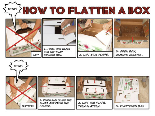 After you sign in, transfer your share into your tote bag. Flatten the box the share comes in. It’s not that difficult if you take a moment to figure it out. Take a look at these step by step photo instructions. Here’s a video of the process.