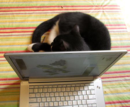 merlot-macMerlot the barn cat likes to help fold newsletters at the end of a long packing day. This week he also played art director as I took pictures of eggs from the different farmers, and later when I prepped photos for the newsletter.
