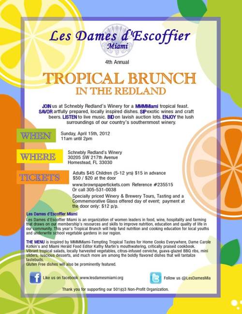 You just had to say MMMM at the annual Tropical Brunch that Les Dames d’Escoffier held recently at the lushly landscaped Schnebley Redland’s Winery. Celebrating local agriculture was the theme this year, and there was quite the assortment of fresh vegetables at the salad table. The highlights were large colorful heirloom tomatoes from Teena’s Pride, and a variety of edible flowers along with small heirloom tomatoes from Paradise Farms.