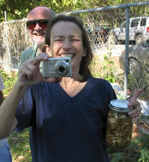An assistant was drafted and the yellow gloves came on to mix the tub full of copped vegetables and chili paste. It smelled great and everybody crowded around to smell the spicy aroma, take pictures and fill their empty jars to take home.
