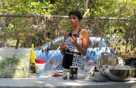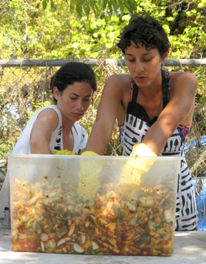 The recipe is posted on three different blogs — Little River Market Garden, My Edible Yard, and mango&lime — so I won’t repeat the exact details. Suffice to say that the ratio is 2 parts cabbage (about one head of Napa or bok choy) to one part radish/daikon/turnip and 2 cups of chili paste. (Carrots, half as much as daikon, can be used to sweeten it a bit.) The heart of the matter is the freshly-made chili paste. Muriel made it with several onions, a prodigious amount of garlic, half as much of ginger, and plenty of fresh and dried hot peppers, which were moistened with cider vinegar, a bit of honey and a bit of olive oil. (OK, so the oil isn’t truly authentic, but Argentineans use olive oil for everything.) She blended it together and soon the thick aroma of peppers and garlic wafted over us sitting in the nearby chairs. “Chili paste is what preserves kimchee,” Muriel said, explaining that garlic and peppers have antibacterial qualities. “Salt is not what’s keeping it sterile.”