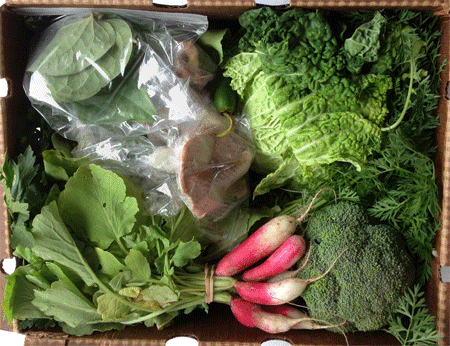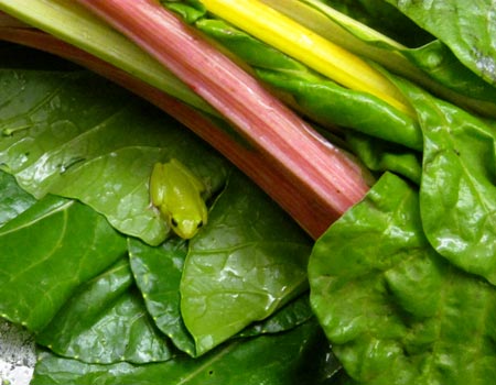 You never know what you’ll find in your CSA box. Got mine home and started unpacking it. As I lifted up the bunch of yukina savoy, something flew out of the leaves and landed back in the box. I spotted a small green frog, looking very bewildered. My camera was handy, so I grabbed a few shots while the little guy wasn’t doing much. It seemed dazed by bright kitchen lights, and after this picture, stuck its head under some broccoli, trying to get out of the light.