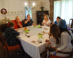 By the time I arrived, the porch was packed with eager, hungry people. Serving tables were set up, but where were the pies? They were inside the house getting judged. The seven judges aka the Supreme Court of Pie, led by Chief Justice of Pie Hedy Goldsmith herself, were ensconced in the dining room of the Merrick House. They were seated around a large table, armed with scorecards, plastic forks and glasses of water.