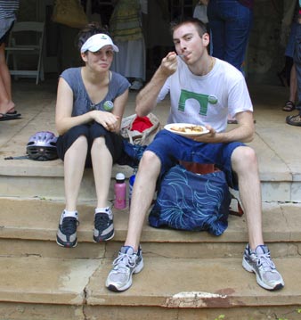 Foodies Naomi Ross and Brian Lemmerman enjoying pie bliss on the porch. They bicycled over from UM in the rain to taste something good to eat.
